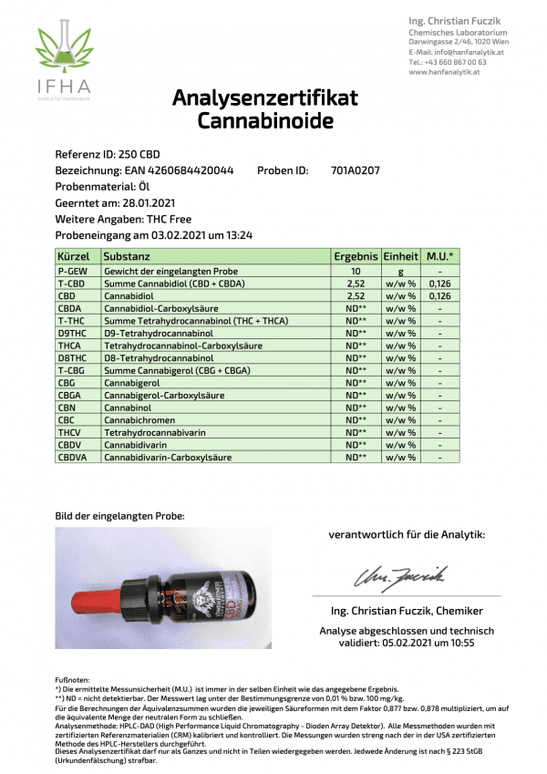 In dem 2,5% CBD-Produkt sind alle positiven Inhaltsstoffe der Hanfpflanze (Cannabinoide, Terpene, Flavonoide) enthalten.