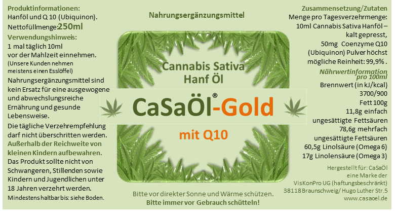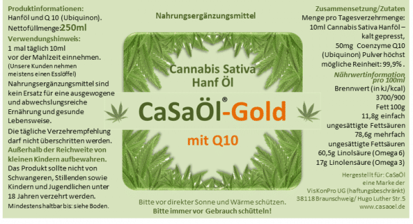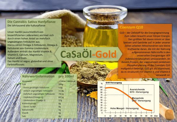 Unser CaSaÖl®( Canabis Sativa Hanföl) wurde mit Coenzyme Q10 (Ubiquinon) veredelt.